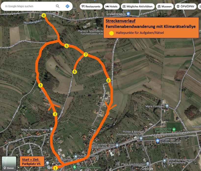 Also kommt doch mit, helft Zoe bei der Lösung der Aufgaben und macht euch auch klimafit für die Zukunft! Die familienfreundliche Route (siehe Grafik) geht über eine Strecke von ca. 3 km. Die Kinder bekommen eine Auszeichnung für die Teilnahme.